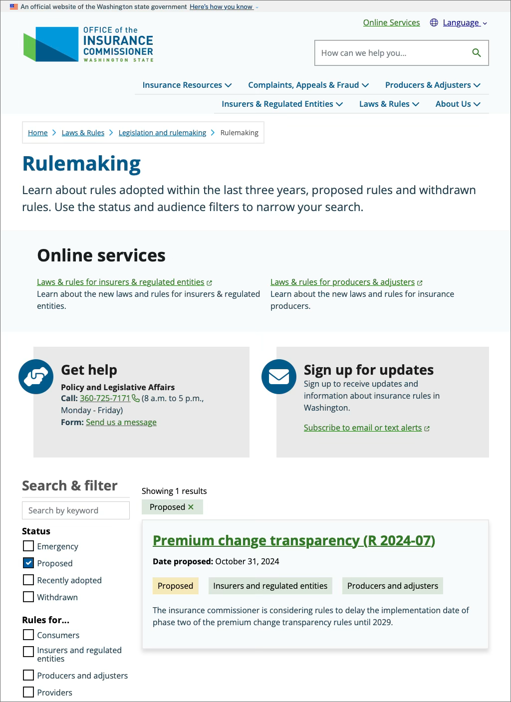 For the Office of the Insurance Commissioner, we added a tagging system to track state rule updates. Tags like “status” allow the team to quickly change a rule’s progress (e.g., “Proposed” or “Withdrawn”), while users could filter content to find the most relevant information. This saved time and improved navigation across the website.